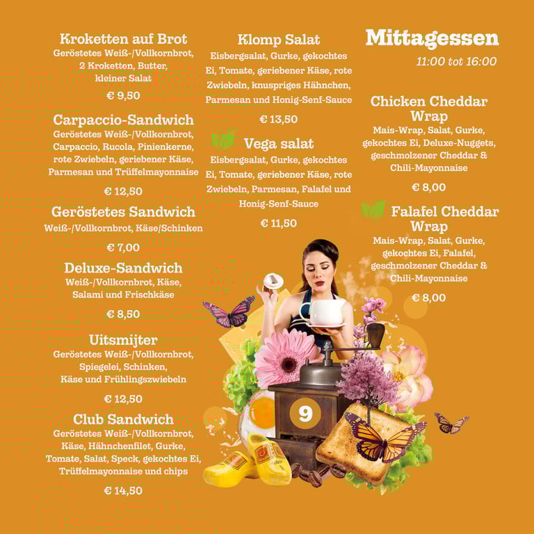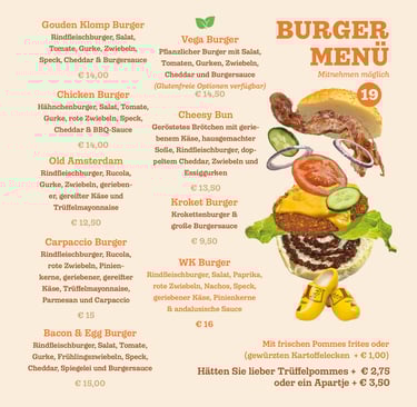 Sie können bei uns auch Speisen zum Mitnehmen bestellen. An bestimmten Tagen und zu bestimmten Zeiten bieten wir außerdem einen Lieferservice an. Weitere Informationen finden Sie unter https://www.thuisbezorgd.nl/menu/brasserie-de-gouden-klomp.